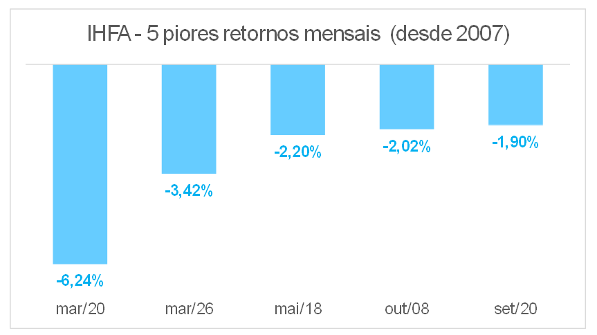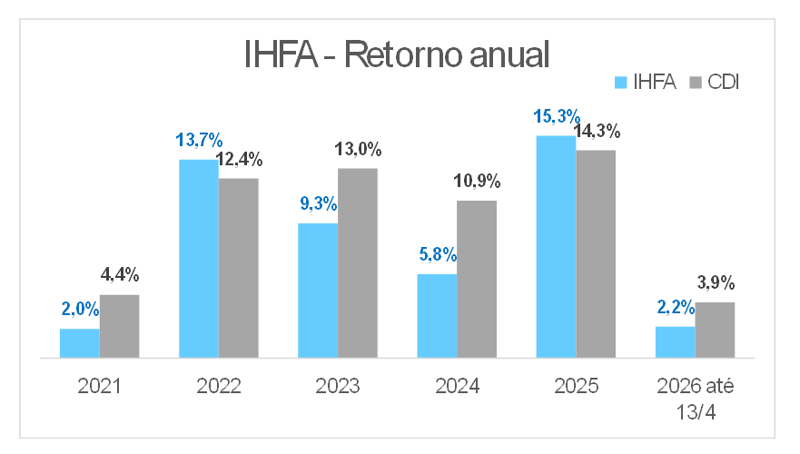 O petróleo disparou, o dólar se fortaleceu, as curvas de juros se abriram de forma desordenada em vários países, e os mercados emergentes sofreram junto. Março de 2026 se tornou um dos piores meses da história do IHFA, com quedas que, em questão de magnitude, só perderam para o início da pandemia em 2020.