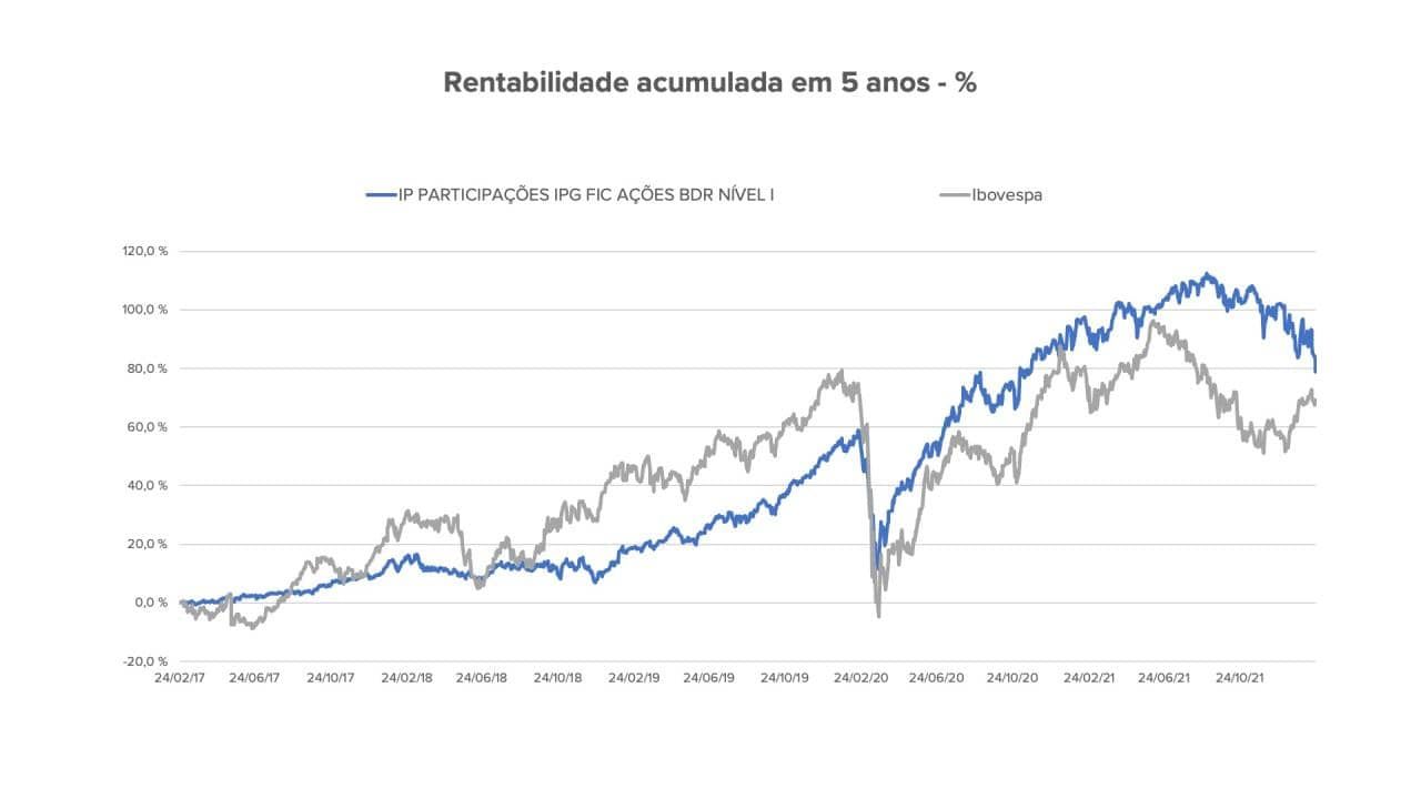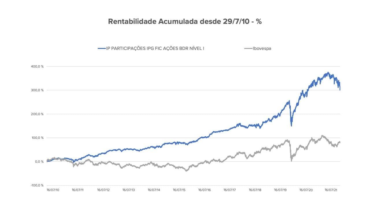 Veja, por exemplo, o histórico de rentabilidade do fundo IP PARTICIPAÇÕES IPG FIC AÇÕES BDR NÍVEL I desde 2010, em um comparativo ao índice Ibovespa (IBOV) no mesmo período.