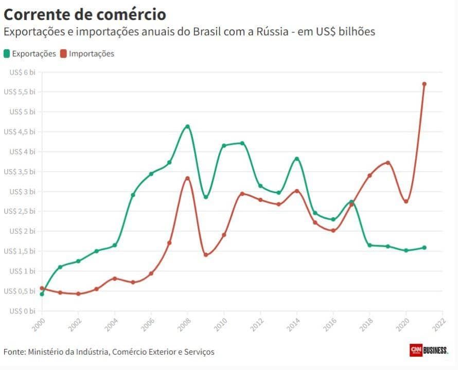 Ao olhar números mais recentes, observamos que o Brasil exportou para a Rússia cerca de 1,5 bilhões de dólares em 2021. Já as importações são um pouco mais significativas: cerca de 5,7 bilhões.