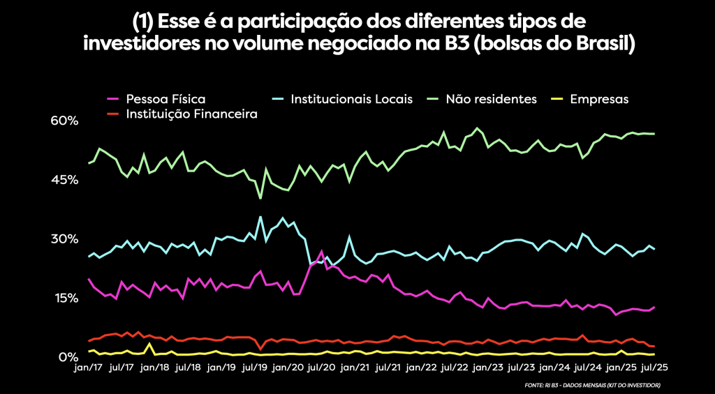 Quando olhamos para a participação dos investidores na nossa bolsa, a B3, vemos um padrão muito claro. A linha roxa no gráfico abaixo representa a participação das pessoas físicas, como eu e você, no volume total negociado.