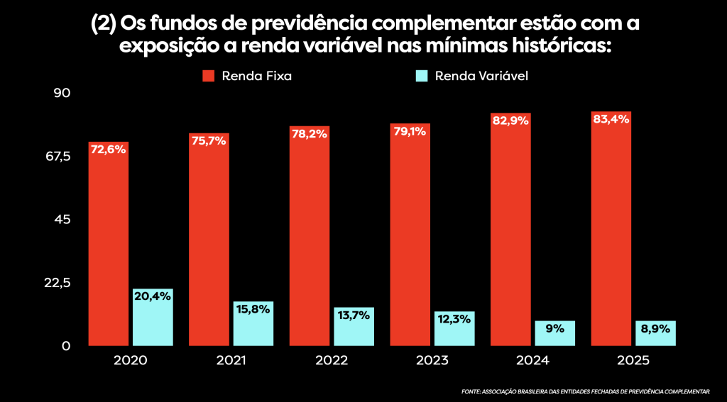 Como podemos ver no gráfico abaixo, a exposição dos fundos de previdência à renda variável está nas mínimas históricas. Em 2020, era de 20,4%, e a projeção para 2025 é de apenas 8,9%.