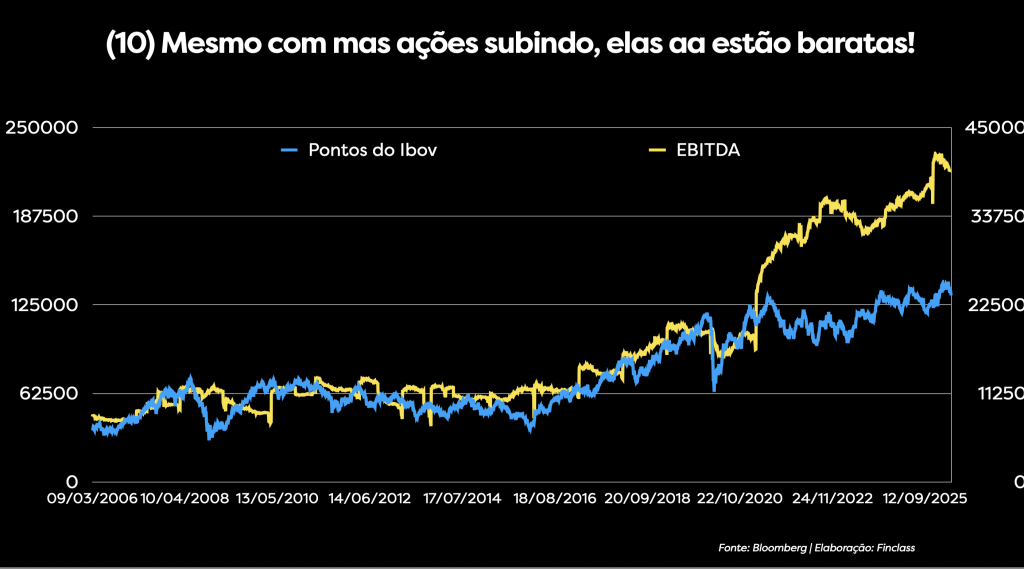 Mesmo com a bolsa subindo 21.6% no acumulado do ano (YTD), as ações ainda estão baratas. Olhe o gráfico abaixo. A linha amarela é o EBITDA (lucro antes de juros, impostos, depreciação e amortização) das empresas, uma boa proxy para a geração de caixa. A linha azul são os pontos do Ibovespa.